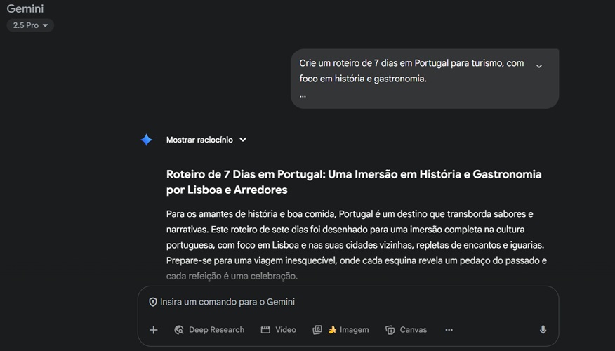 • “Crie um roteiro de 7 dias em Portugal para turismo, com foco em história e gastronomia.”